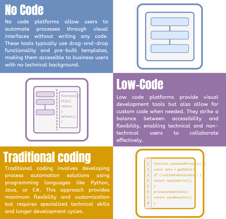 No-code platforms require zero coding knowledge but may have more limitations for highly specialized or complex processes. Many platforms now offer both capabilities, allowing businesses to start with simple no-code automation and progress to more sophisticated low-code solutions as their needs evolve.
